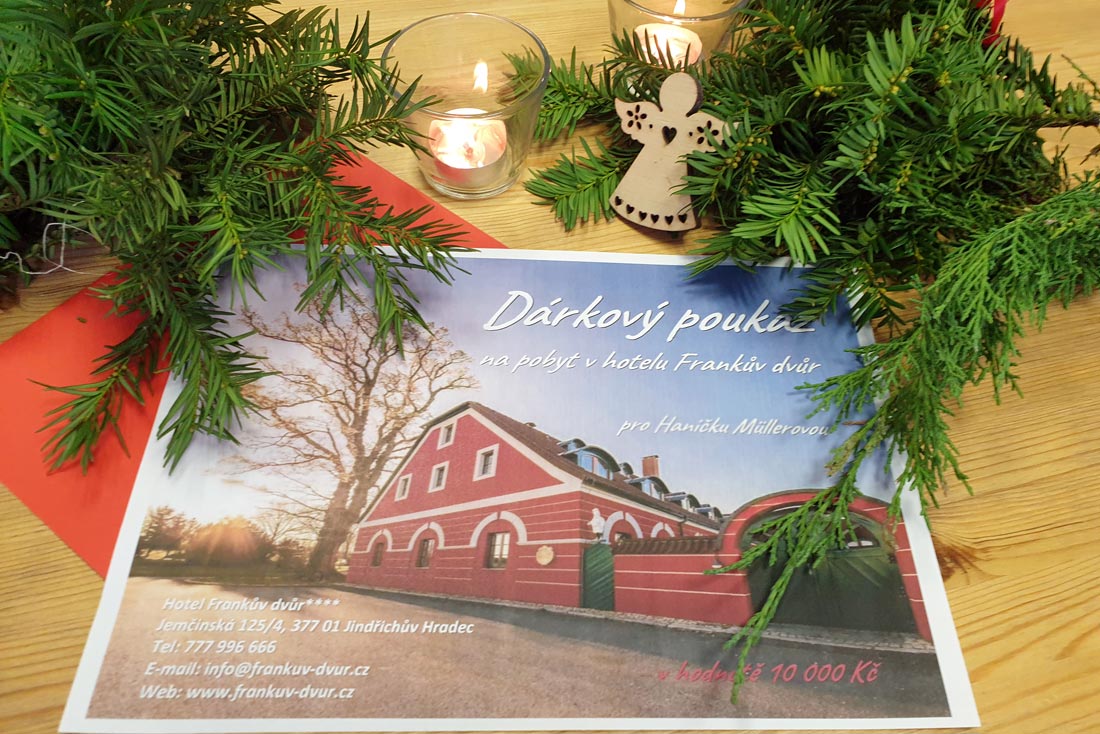 Nevíte, čím potěšit své blízké, zaměstnance nebo věrné zákazníky? Věnujte jim zážitkový pobyt s relaxací a umožněte jim strávit čas v nádherném prostředí, které nabízí hotel Frankův Dvůr. Připravili jsme pro vás dárkový poukaz, jehož hodnotu si sami určíte. Poukaz je platný jeden rok a obdarovaný si sám sjedná termín pobytu podle toho, jak mu to nejlépe vyhovuje.