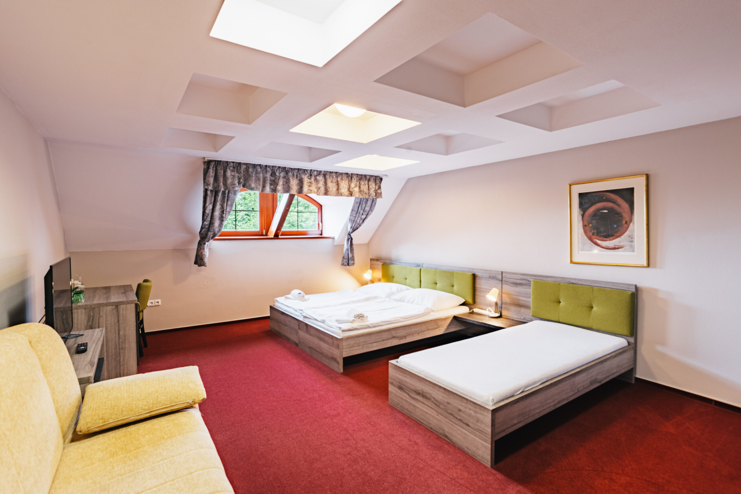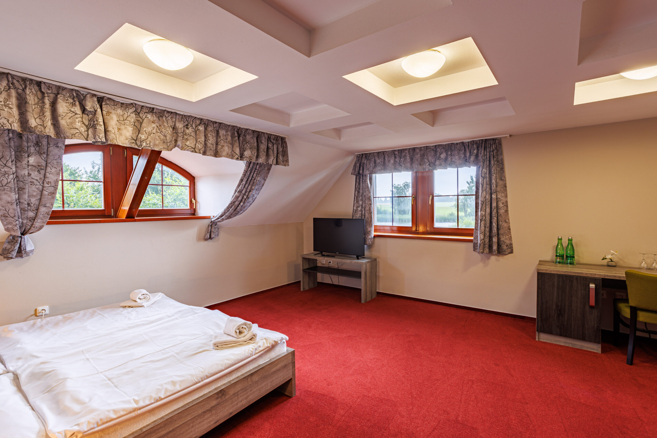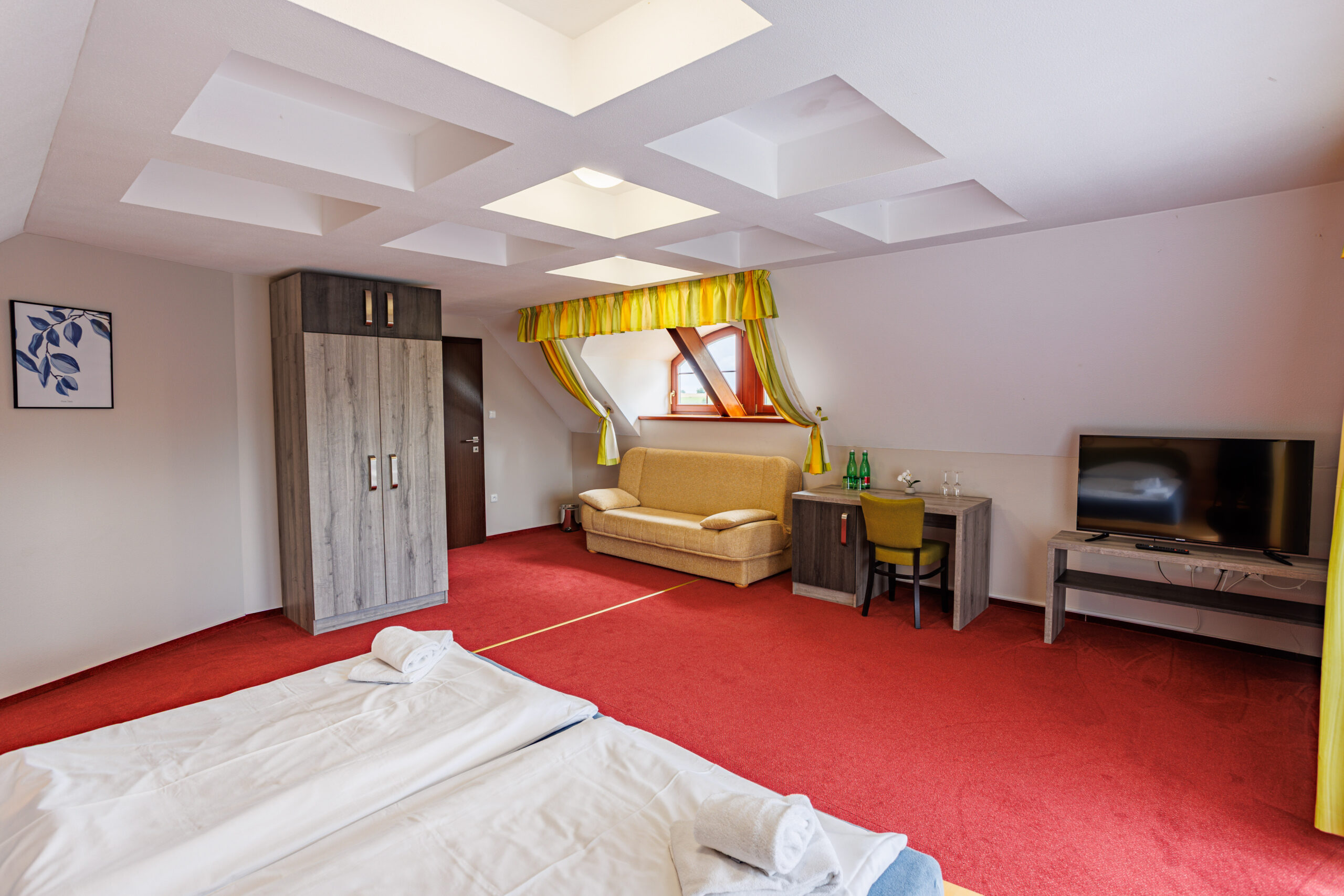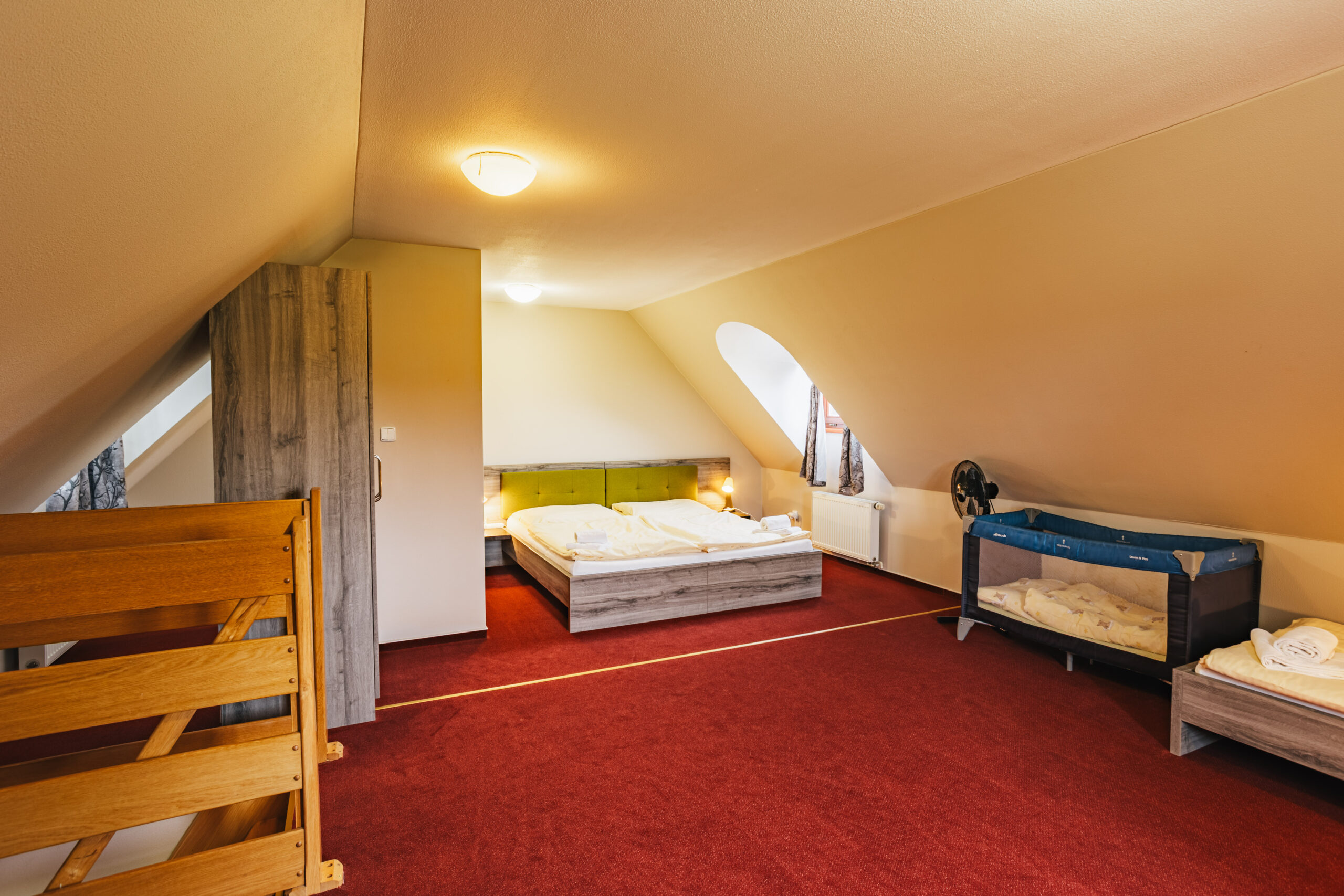 Císařský apartmán je oblíbený pro rodiny i páry. K dispozici jsou 2 pevná lůžka a 1 přistýlka. Je zde sprcha i vana.